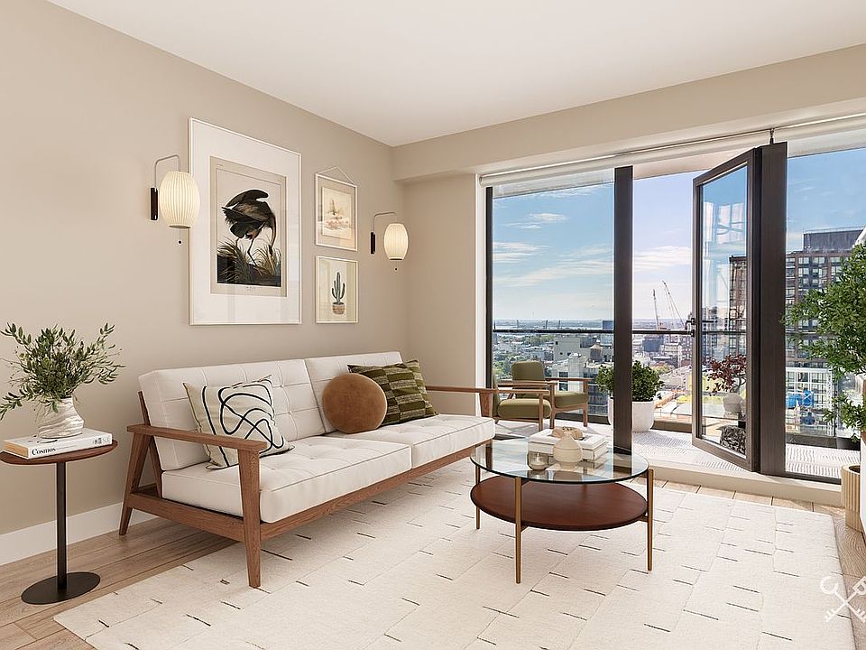 Inside, it’s all quality: 6" wide-plank oak floors, Bosch appliances, Canadian white-oak veneer lowers with white-lacquer uppers, Caesarstone Frosty Carina counters, Signature under-mount sink with Grohe faucet, and in-unit Bosch W/D. Central heat and AC keep the climate dialed. Spa-caliber baths bring walnut vanities, white Caesarstone, Signature fixtures, and a deep soaking tub.