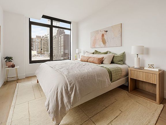The tranquil primary suite includes a spacious walk-in closet and a luxurious en-suite bathroom with refined finishes. The secondary bedroom easily accommodates a king-size bed, while all three bedrooms enjoy inspiring open views all the way to the Statue of Liberty.
