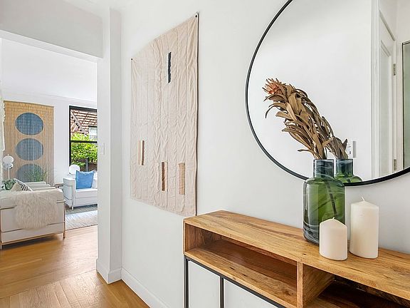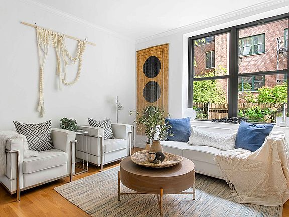 Upon entering the apartment you are welcomed by a cozy foyer and coat closet leading the way to an airy living area bathed in soft sunlight streaming in from oversized windows overlooking lush garden views.