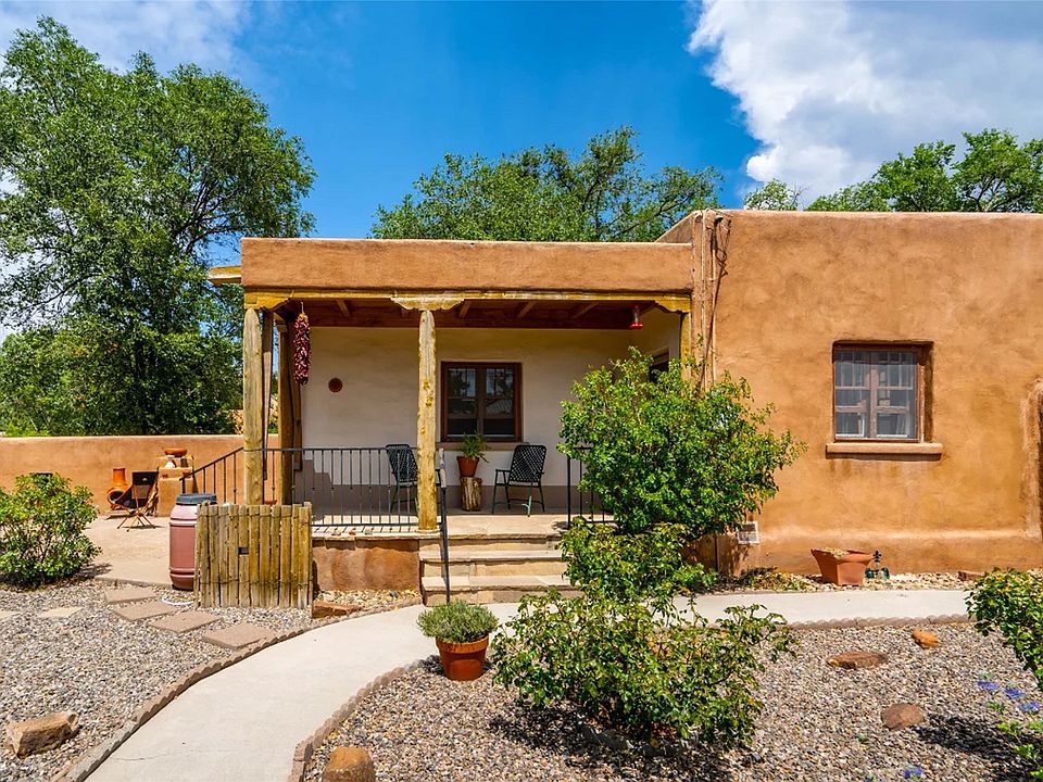 Tucked behind curved, gated walls in the heart of South Capital, this historic Spanish Pueblo Revival home offers the ideal blend of charm, location, and income potential. Built in the 1930s with iconic 15-inch adobe walls, original hardwood floors, and divided-light sash windows, this home exudes authentic Santa Fe character. Currently operating as a successful short-term rental, this property has a strong rental history, making it an excellent opportunity for investors or those looking to offset ownership costs with passive income. The thoughtful floor plan includes two private bedrooms, a spacious living area, and excellent flow for both hosting and relaxing. Step outside to enjoy the beautifully crafted flagstone patio and shaded portal, surrounded by mature trees and romantic gardens. Backing onto the historic Arroyo Tenorio Acequia, the setting is peaceful yet connected. Boasting a Walk Score of 91, you’re just moments from the Plaza, River Walk, top-rated restaurants, cafes, art galleries, and Santa Fe’s vibrant cultural scene. Whether you’re seeking a charming residence, a part-time pied-à-terre, or a turn-key rental investment, this South Capital gem delivers. Imagine the Possibilities and make this beautiful home yours!