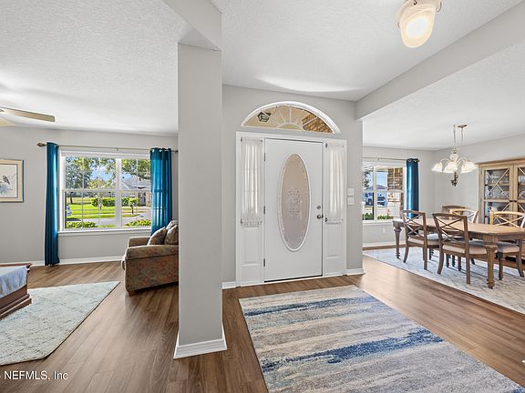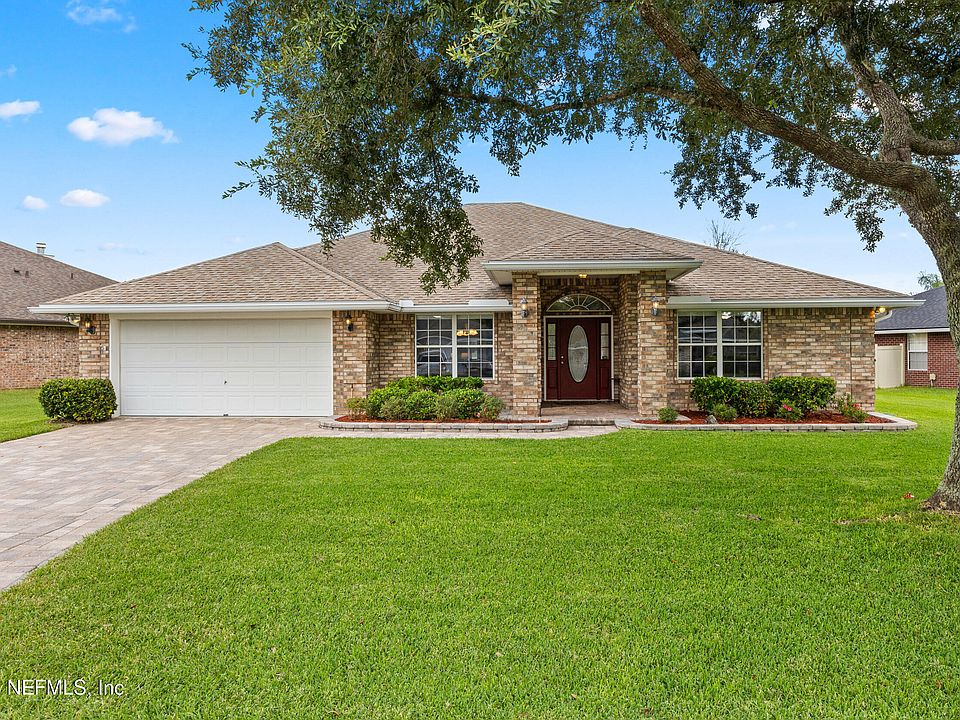 Welcome to this virtually MAINTENANCE-FREE, ALL-BRICK home that is a multi ''Yard of the Month'' winner with beautifully landscaped curb appeal in Lake Asbury/Green Cove Springs. NO CDD! You're greeted by an expansive PAVERED DRIVEWAY and a new Roof with 30 year architectural shingles next week, and the convenience of an oversized two-car garage. Gutters and a full irrigation system in both the front and back help maintain the lush landscaping. Step inside to a spacious foyer with soaring ceilings and an open layout connecting a formal dining room and a formal living room/flex space. With NO CARPET, this home is finished entirely in easy-to-maintain LVP and TILE. CUSTOM BLINDS have also been professionally installed throughout.