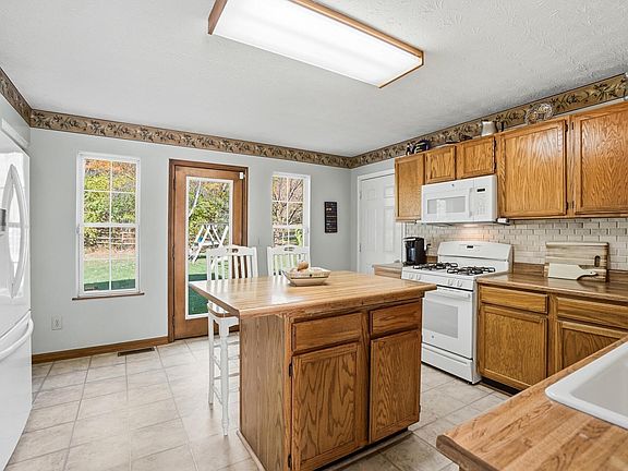 Gas cooktopFenced yardFresh paintWooded viewKitchen islandShed for extra storageCovered front porch