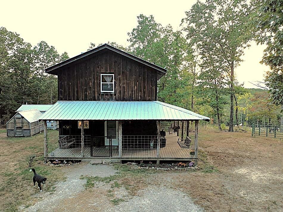 Fully developed homestead in the Ozarks! Established and ready for new owners to enjoy gorgeous views; peace & privacy; and the security of wood heat, independent food sources, water, even in absence of power, an in-ground storm shelter, & solar power backup. The main home includes 1100 square feet of inviting, rustic-style living space, 2 bedrooms that could easily be transitioned into 3, 2 full bathrooms, an really nice wood heat & cook stove, additional electric & propane heat sources, electric AC, a covered & fenced wrap-around deck, & a covered back deck overlooking a privacy-fenced play yard. Views from the decks are spectacular! The 192-s.f. tiny home has power, heat & cooling, a small kitchen w/dining area, a tiled hearth ready for a wood stove, a bedroom area, a half bath, an attached covered storage area, an attached carport, and water catchment w/a 550-gallon storage tank. Both homes have solar power backup & off-grid potential. Bring your large & small livestock - this property is ready! The acreage is approximately 80% fenced with good horse fencing (barbed wire, no-climb, & electric). The property also features a a newly built 28x30' pole barn, a double carport-style livestock shelter, well-fenced goat pens w/2 goat sheds, fenced chicken yard w/coop, & 10x12' metal storage shed. Food production includes 6 large raised garden beds & a pallet garden; 16x8' greenhouse w/automatic temperature-sensored windows; 3 apple, 4 peach, 3 pear, & black walnut trees; elderberry & blueberry bushes; and growing garlic. There is also a beautiful dogwood tree in the yard. Working from home is fully supported with high-speed fiber optic internet. The shared well (4 residences on private road) has back-up solar power & a hand pump for assurance of water even in a power outage & cloudy weather. There are no restrictions other than no new residences are to be added to the existing well. There is also a potential for additional 8.5 acres w/a private well.