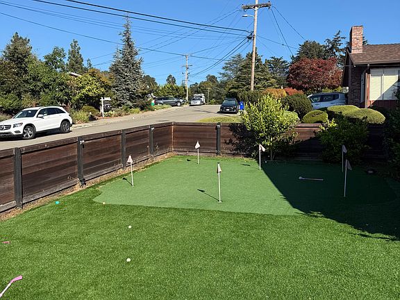 Front Yard Paradise artificial lawn, fenced putting green with golf turf & holes, plus lemon and lime trees.