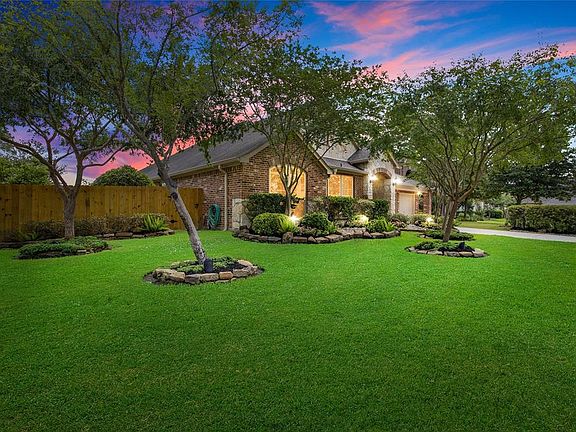 Welcome Home to this breathtaking 4 bed, 3 bath, 1-story, corner lot GEM! This beautiful home will knock you off your feet! Custom interior decorations, columns, and inset wall colors with matching iron scroll-work throughout foyer, hallways, and transoms. Coffered dining room has custom hand painted design. Elegant formal dining room as you enter the home. Gorgeous open floor plan with a huge kitchen and living area. The media room is positioned perfectly with this floor plan. Master bedroom is oversized and highlighted with his/her closets! Too many upgrades to list but heres a few: fresh interior paint (2019), 6 fence (2019), stained deck (2019), refreshed landscaping (2019), interior doors are 8, business class networking including full server rack with patch panels (2017). HARVEY DID NOT FLOOD THIS HOME!