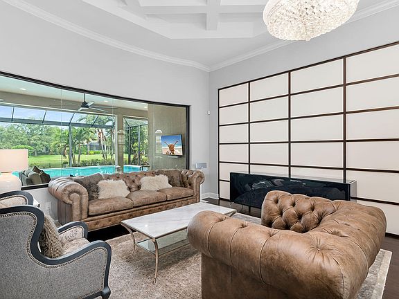 Beautiful sunsets from this home with western exposure overlooking the large lake. More than 3,500 square feet of living space under air including an open floor plan with a living room, dining room, family room, 3 bedrooms plus a den, 3.5 baths. Special features include a full-house Generac generator with Wi-Fi, central vacuum, 2 air conditioners, plantation shutters throughout the house and a glass featured wine room. The gourmet kitchen includes GE Cafe stainless steel appliances, a wine refrigerator, under-cabinet lighting, glass pendant light fixtures, glass tile backsplash. The primary suite bath has porcelain tile flooring, a walk-through shower with multiple shower-heads, dual sinks and a linen closet. Impact doors and windows throughout with Storm Smart Screens on the lanai which features about 2,500 square feet of outdoor living area including the largest residential pool in Fiddler's Creek, a 9-person spa, an extended lanai with natural stone pavers and a picture window screen. The outdoor kitchen includes a Fire Magic Echelon grill, Big Green Egg smoker, mini refrigerator, ice-maker, with a sink and granite countertops with a full stone backsplash extending to the ceiling. The laundry room includes porcelain tile flooring, a utility sink, shelving, and GE front-loading washer and dryer. The garage has epoxy flooring and overhead storage racks. A life of luxury is ensured in this residence enhanced by the 54,000-square-foot club and spa, full-service spa, fitness center complete with personal trainers and fitness classes, three swimming pools, championship golf courses, bocce, and six tennis courts and pickleball courts with competitive teams. Fiddler's Creek is close to Marco Island Executive Airport, beaches, shopping, restaurants, boating and easy access to Naples 5th Avenue.