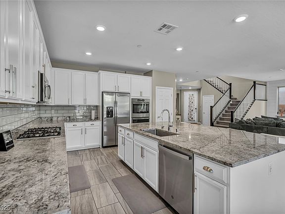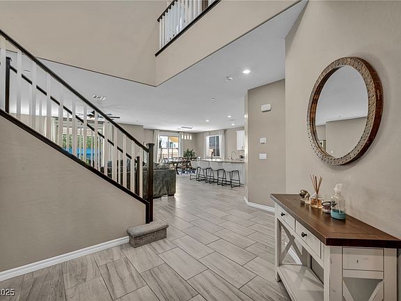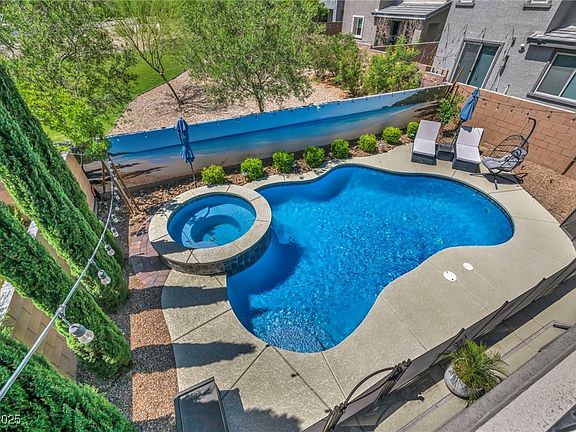 Beautifully maintained and move-in ready, this spacious 5-bedroom, 3-bath home offers the perfect blend of comfort, function, and style in a gated Henderson community. The open-concept floor plan features a bright living area, modern kitchen with island, stainless steel appliances, and walk-in pantry. Upstairs, the primary suite boasts a private balcony with park views and a large custom closet. Step outside to one of the best backyards around—with a sparkling heated pool, covered patio, and professionally landscaped yard ideal for family gatherings and outdoor fun. Additional highlights include solar panels, powered shades, custom storage throughout, Ring cameras, and an oversized garage with built-ins. Appx living area -3,058 sq., garage - 497 sq.ft. Immaculate condition and pride of ownership throughout—this is the home your family has been waiting for!