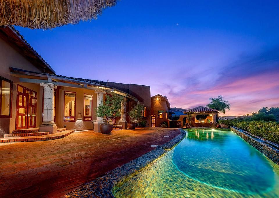 LOCATION, LOCATION, LOCATION! This extraordinary Early Californian Hacienda estate, crafted by Tripp McCallister and architect Dena Gillespie, is a rare gem nestled within the prestigious guard-gated community of Steele Canyon Golf Club. This stunning home offers a rare opportunity to live on one of Southern California’s most celebrated golf courses—right on the Par 5 9th hole of the Gary Player-designed 27-hole championship course. Every detail of this estate has been carefully curated to deliver a timeless blend of Old World charm and modern luxury. From the moment you arrive, you’re greeted by authentic Mexican pavers and dramatic Cantera stone columns sourced from Tecate—just a preview of the craftsmanship that awaits inside. Inside, the spacious living room impresses with sky-high wood-beamed ceilings, grand picture windows, and panoramic views of lush fairways and surrounding hills. The warmth and richness of the home are evident in the custom mahogany doors, windows, and trim—expertly handcrafted in Belize. In fact, the study and bar are uniquely paneled with seven rare hardwoods from the Belizean rainforest, showcasing the artistry throughout. Six fireplaces add character and comfort, including a stunning hand-carved mantle in the living room. The family room, designed for entertaining, includes a custom copper-topped bar and intricate wrought iron details that elevate the atmosphere. The chef’s kitchen is both beautiful and functional, featuring premium Wolf and SubZero appliances, a deep soapstone sink, and a unique hand-thrown pottery vegetable sink. Just off the main living areas, you’ll find a fully outfitted gym with a sauna, plus a richly paneled office ideal for working in peace and privacy. Outdoors, the resort-style amenities continue. Enjoy evenings in the covered BBQ and dining area, relax under a palapa, or take a dip in the dramatic pool finished in natural stone and inspired by Belize’s famous Blue Hole. The professionally landscaped grounds also include a Cantera stone fountain, multiple seating areas, and incredible views of lakes, fairways, and distant mountains. Additional features include a three-car garage plus separate golf cart garage, a fully paid solar system, and thoughtful finishes throughout—from a hand-built boveda ceiling in the entryway to artisan wrought iron accents that echo the home’s hacienda roots. Featured in San Diego Home/Garden Magazine, Garden Ideas & Outdoor Living Magazine, Dream Homes Magazine, and Garden Deck and Landscape Magazine, this exceptional property is more than just a home—it’s a lifestyle. Don’t miss the chance to own this masterpiece of architecture, craftsmanship, and location.