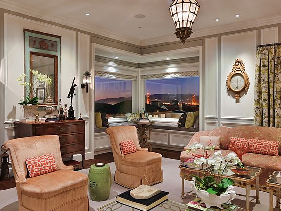 Pacific Heights Grand Mansion: One of a kind. Newly constructed. 24,000SF. Expansive Golden Gate Bridge and Presidio views. A European style courtyard with custom stone fire pit is surrounded by the gourmet kitchen, living room, family room & grand gallery for art. Master suite features a wet bar, his and her baths & his and her walk-in closets with an adjoining balcony. A formal dining room which comfortably seats 30 guests is serviced by a separate caterer's kitchen with access to an old world mahogany and leather gentlemen's bar. World class amenities include a glass-walled fitness center with yoga studio and spa overlooking an indoor full size basketball court. Other highlights are an HDGolf simulator, billiards playroom, & wine lounge with a 1,500-bottle cellar. High speed commercial elevator services all 5 floors. Radiant heat throughout. Separate entrance leads to a contemporary 2-bed guest apartment and an au pair suite, The garages can accommodate ~22 cars.