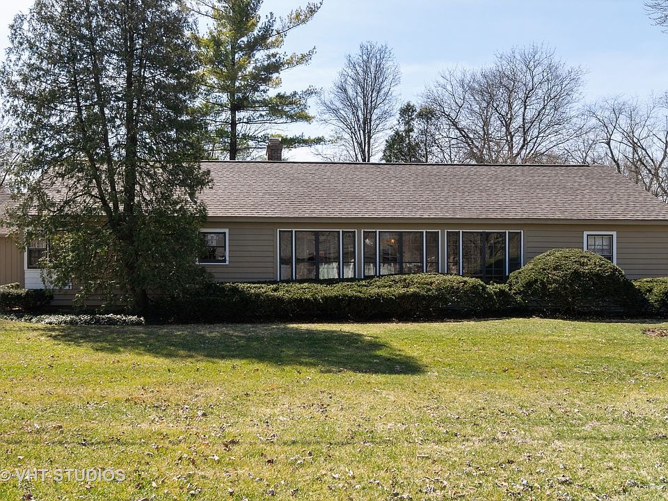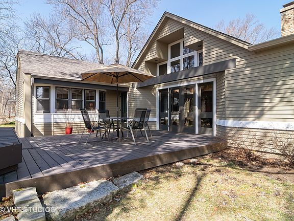 Ranch has so much charm & architectural details, 8" baseboards, hardwood floors, great windows. Lovingly cared for and maintained. Set on a beautiful .45 acre lot walking distance to prairie path on private street. Large open living room, soaring, vaulted & beamed ceiling, brick, wood burning fireplace, full wall of built in bookcases. Sun-room, slate floor, windows (currently used as dining room). Kitchen with eat in area surrounded by windows, corian counter, Thermador, gas stove, subway tile back splash, all app stay. Office, carpet, crown molding. Master bedroom, ample closets, hardwood floor with private bathroom, jetted tub/shower. Bonus room for workshop/art studio/playroom or extra flex space. Large family room, carpet. Laundry room, utility sink. Updated 2nd bath, grey subway tile. 24x24 garage plus, easy access to attic by pull down stairs, cabinets. Sit and enjoy nature/flowers/quiet on the deck. Enjoy country living! Updates include: boiler, a/c, H2O heater and more.