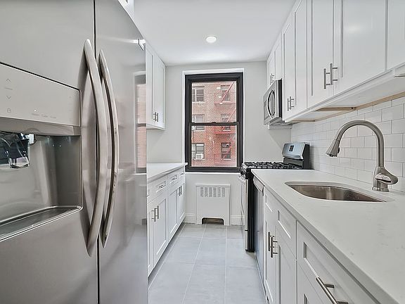 The windowed kitchen boasts brand-new stainless-steel appliances including a dishwasher and microwave, Shaker white cabinetry, Carrara Marmi countertops, tiled backsplash, and tile floor.