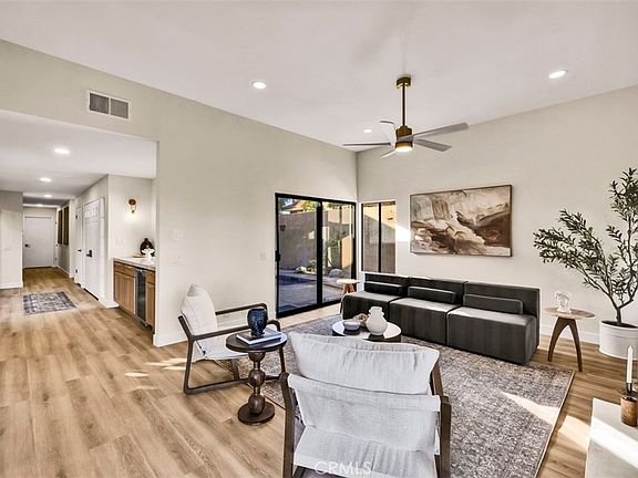 Inside, this fully renovated 2-bedroom, 2-bath home offers soaring ceilings and an inviting open layout. The living room connects effortlessly to the dining area, making the space feel open, bright, and perfect for gatherings. The kitchen is beautifully appointed with white oak cabinetry, stainless steel appliances, quartz countertops, and a peninsula with bar seating. A nearby bar area with a wine fridge elevates the entertaining experience.