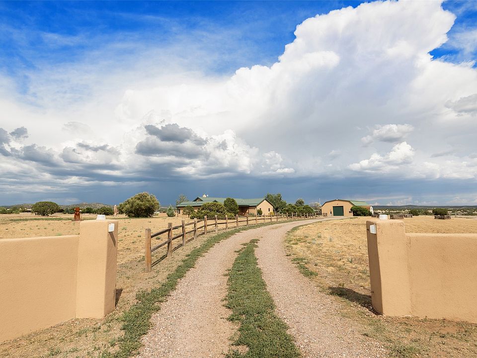 Vistas in every direction can be enjoyed from this lovely ranchette located on 10 acres in desirable Los Caballos. The 1,816 SqFt home lives large due to its open floor plan, gracious bedroom separation and beautiful finish quality throughout including brick floors, beamed & planked ceilings, elegant fireplaces and numerous windows filling the spaces with natural light. The primary bedroom opens onto the north-facing portal and hosts a double vanity and walk-in closet. A separate 1,700 SqFt. 1 bed/1 bath casita is privately sited and includes a spacious, multi-purpose living room, plus a kitchen/dining area. Ample storage and hobby space are available in both the heated 3-car garage and the 3,000 SqFt studio/shop/garage which includes a heated office and half bath, two EV chargers and three RV hookups. This well-maintained property has the advantages of solar power, water catchment, two septic systems and a pitched metal roof. Located near the amenities offered in the Agora shopping center, the trails in the Galisteo Basin Preserve and only 20 minutes to Historic Santa Fe.