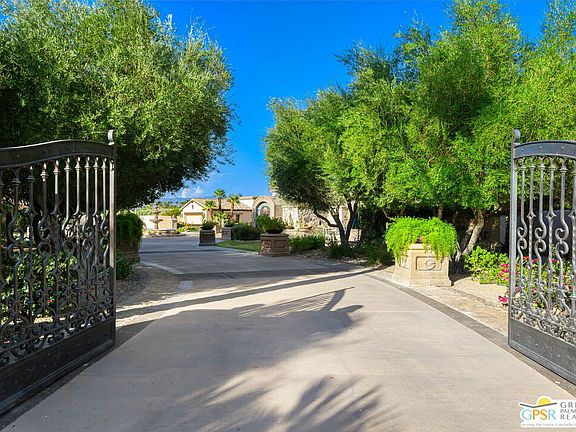 "La Belle Dame" is a masterpiece by Juan Carlos Ochoa in Clancy Lane Estates. In the heart of Rancho Mirage's most coveted enclave, this gated, one-acre Mediterranean-inspired estate by celebrated architect Juan Carlos Ochoa is a singular work of art, uniting Old-World craftsmanship with resort-caliber amenities. Restored inside and out, the 6,424 sq. ft. single-level villa offers an unparalleled blend of architectural integrity, privacy, and timeless luxury. Pass through custom wrought iron gates into a secluded world where mature cactus gardens, an olive tree grove, and mountain views set the tone for the extraordinary. At the center of a sweeping motor court, a 10-foot hand-carved Cantera stone fountain commands attention. Two separate garages, one attached that is climate controlled, one detached, offer parking for four, with additional guest parking for six. Every detail speaks to Ochoa's signature craftsmanship: Mexican Saltillo tile and hand-hewn oak plank floors, vaulted ceilings with exposed beams, arched passageways, bullnose corners, and hand-carved stone fireplaces. Custom Italian Albertini doors and cabinetry, Venetian plaster walls, intricate ironwork, and stone corbels are woven throughout the interiors, evoking the romance of a Spanish monastery while providing the comfort of modern living. The formal living room, anchored by a grand fireplace and wood-beamed ceilings flows seamlessly to the terrace through French doors. A spacious formal dining room leads to the chef's kitchen, crowned with a stained-glass illuminated ceiling, Wolf range, dual ovens, butler's pantry, Sub-Zero refrigeration, and a 200-bottle custom climate controlled wine cabinet. Multiple entertaining areas, both formal and casual, open to the outdoors, blurring the lines between interior elegance and exterior splendor. The primary wing is a sanctuary with dual walk-in closets, spa-inspired bath adorned with hand-painted Spanish tile, private den, and an executive office. Three additional ensuite bedrooms each offer distinctive character and luxurious finishes. A poolside cabana with half bath ensures guest comfort during long afternoons in the sun. The south-facing backyard mirrors a private resort, tiled swimming pool framed by gas fire bowls, spa in a stone grotto, four-sided stone firepit, and a pavilion with a fully equipped outdoor chef's kitchen. Multiple stone fountains, lush gardens, and intimate patios create a series of enchanting vignettes for entertaining or quiet reflection. Clancy Lane Estates is a gated, private sanctuary renowned for its exclusivity and proximity to world-class dining, shopping, golf, and cultural attractions. This home is more than a residence, it is a once-in-a-lifetime acquisition for the connoisseur of fine architecture and unmatched craftsmanship. This work of art is shown to qualified buyers by appointment only.