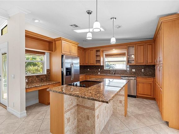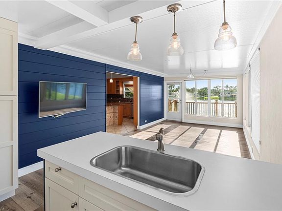 Move right into this immaculate turnkey lakefront home, offering stunning lake and fountain views from every room, including the lanai and enclosed sunroom. The open great room floor plan features a beautifully upgraded kitchen with solid wood cabinets, an island, granite countertops with a backsplash, a cooktop, and built-in oven and microwave. This home is loaded with fine details, including tile and wood flooring, along with crown molding, are found throughout the home. The Florida Room has been refreshed with a coastal touch, featuring shiplap siding and new flooring. Both large bathrooms have been remodeled for modern comfort. Located in a quiet and friendly neighborhood, this home is walking distance to the community saltwater pool and clubhouse. With grocery stores, restaurants, and shopping just 5 minutes away, you’re perfectly positioned to enjoy everything Southwest Florida has to offer. Plus, being close to both Marco Island and Naples beaches means endless opportunities for sun and fun. Water, sewer, cable, and lawn maintenance are all included in the quarterly fees, and this welcoming community is open to all ages—no 55+ restrictions here and no lot fee!