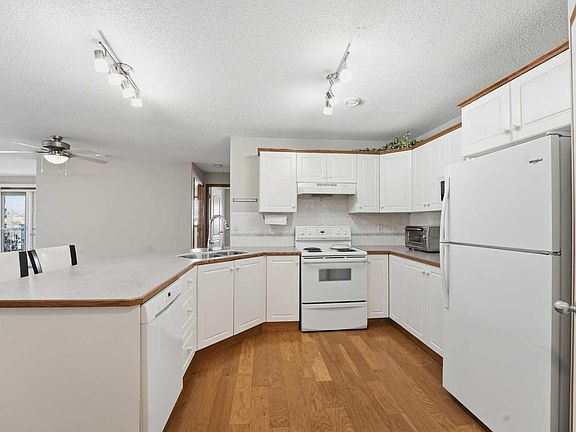 Maintenance free living in this beautifully kept top floor unit in Devonshire Estates. Good sized tiled entryway with coat closet and man door into the heated 11x21 garage with newer epoxy flooring. Upstairs to the main area, the living room has hardwood flooring and is spacious with lots of natural light, a gas burning fireplace, garden doors leading to the deck with gas hookups for your BBQ and faces the green space. The kitchen is open concept and has white cabinets & white appliances. Lots of counter space and an eat up bar complete with a walk in pantry. Just off the kitchen is the laundry room. It is big with ample room for storage. The eating area is large enough for a big table. The primary bedroom is big with double closets and has a 3pc ensuite. The second bedroom is a good size and there is also a 4 pce main bath. A must see! The condo fee of $477.96 includes all utilities except electricity.