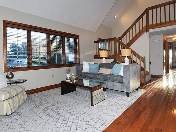 Set far off the road is this Stunning, sun-drenched Aspen-style Contemporary by Brendon Homes*From the moment you enter you're bathed in sunlight and enveloped in warmth*Striking huge vaulted, skylit, fireplaced (w/gorgeous gas fireplace unit) Great Rm*Newer roof & windows*New Trex front entry, spacious rear deck, which looks out to a lovely treed, private backdrop and balcony off Primary Suite*Newer rich wood Kitchen w/newer appliances, granite, tiled backsplash & tiled floor*Updated hardwood flooring for entire main flr (except kitch/bath)*Full bath on main floor has new tiled shower, marble counter & custom cabs*New carpeting on upper level*Upper level offers an oversized loft, which can be another living area or perhaps large office, plus a Primary Suite & Primary Bath w/new quartz & luxury vinyl flooring plus vaulted ceilings*Unfinished lowest level has laundry area and two-car garage plus plenty of room to set up a gym or finish in the future*Lovely flat lot with treed border.