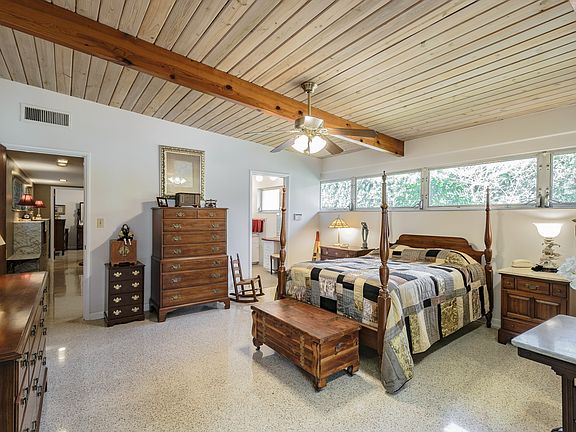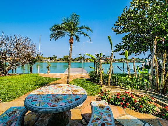 This unique, impeccably-maintained mid-century modern waterfront home still retains its original 1954 authentic charm and is located on a quiet street in Paradise Island. There are tongue-and-groove wood beam ceilings throughout. This spacious home boasts terrazzo floors, 2 large bedrooms, 2 full baths, a formal living room and dining room, and a large family room with a wood-burning fireplace. The family room has the original pecky cypress wet bar convenient for entertaining. Oversized windows along the entire back of the home provide for breathtaking views of the intracoastal. There is a stainless steel kitchen with the original 1954 Thermador oven and walk-in pantry. The additional 1002 sf has a deep 1 car garage, an adjacent laundry room with a half bath, and an additional room (10x8) which could be used as a 3rd bedroom, office, or storage. Also included is a beautiful 50 ft breezeway leading to the front door with 2 security gates. There is an artesian well for irrigation, a reinforced seawall, and convenient electric hurricane shutters, and a pool-sized private yard. The back of the house faces north. Short walk to the beach, restaurants, and shopping. This home is a must-see!! For Sale By Owner, for appointment call 727-219-3663. No emails, please.