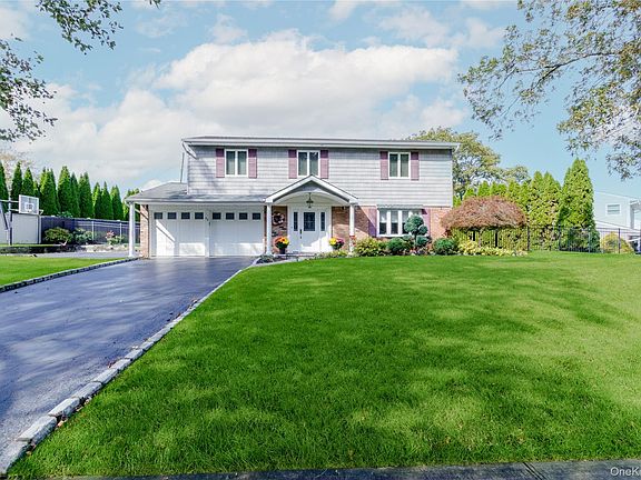 Beautiful Split in Nesconset! Welcome home to this stunning 4-bedroom, 2.5-bath split featuring an inground pool and gas heating. This spacious home offers oak floors throughout, high hats for beautiful lighting, a large living room, a cozy den with a wood-burning fireplace, sliders to backyard , and a full formal dining room perfect for entertaining. The modern eat-in kitchen features Maple cabinets, granite countertops, and stainless steel appliances. The laundry is conveniently located on the first floor. Basement is finished perfect for a playroom or a home office. Upstairs, the primary suite includes an updated master bath and a walk-in closet that could easily be converted back into a fourth bedroom if desired. Enjoy outdoor living in your private backyard oasis with an inground pool and basketball court. Additional highlights include a two-car garage and a prime location close to shopping, parks, and schools. This home truly has it all .. space, style, and comfort in the heart of Nesconset!