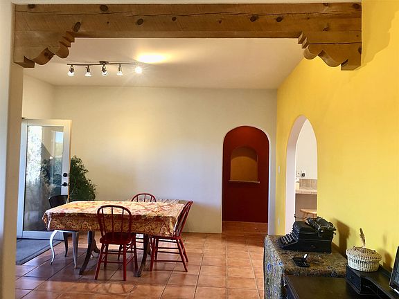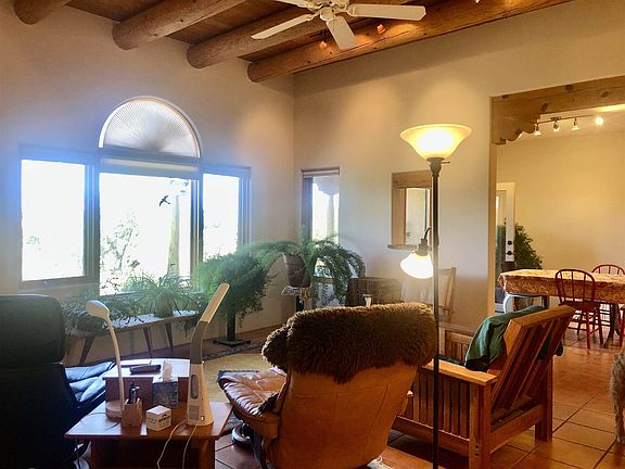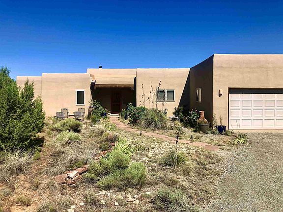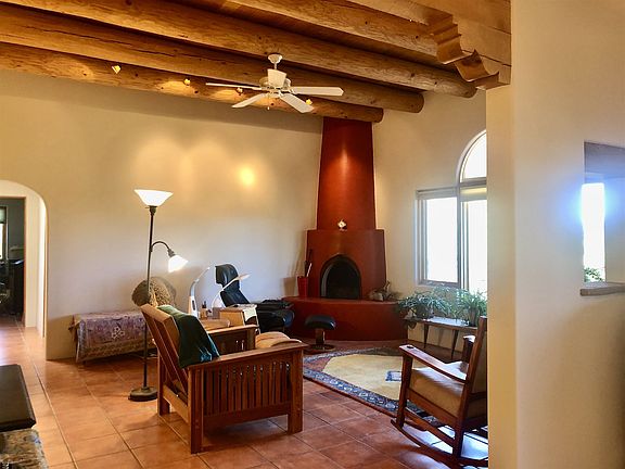Bordering a wide 'greenbelt' and offering wonderful mountain and sunset views from both inside and out with 2 flagstone patios/portals with viga ceilings. One-owner home buit by Adobeworks sited on a 2.9 acre lot well set back from the road for privacy. Attached but seprate studio/office/guest space has its own 1/2 bath with its own ingress/egress to the outside. The home features a split 3 bedroom 2 full bath single level floorplan, no steps. Tile floors, 2 kiva fireplaces, nichos and viga ceilings. Kitchen has wrap around tile countertops, upper and lower cabintes, gas stove. In-floorl gas radiant heat (even in the studio). All paved access to the home from the very begiining of Eldorado, no dirt roads! Plentiful community amenities- community center, swimming pool,tennis courts, hiking trails, library, senior center, K-8 school and more...