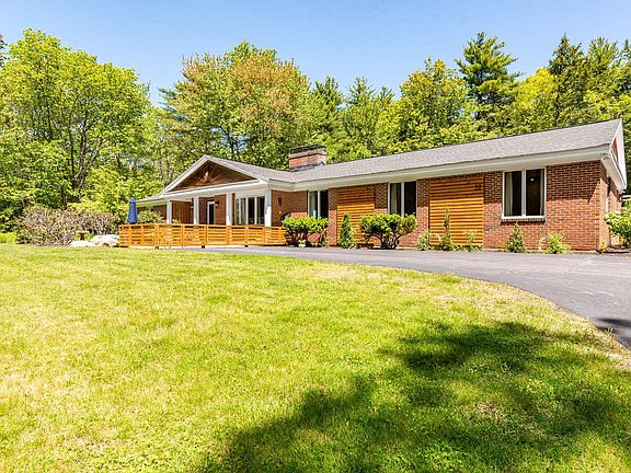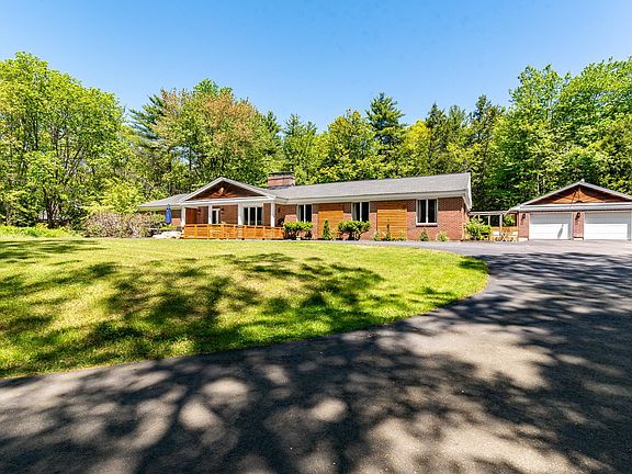Custom contemporary Ranch with approximately 3800+/- sq.ft. of finished  space appointed throughout with modern design elements & fully equipped w/all brand new appliances, lighting & plumbing fixtures & custom tile & granite. This splendid home features full brick, solid construction with spacious rooms for entertaining, recreation & living. Located in a rural setting on a 7.76 acre wooded lot close to routes of travel & proximal to shopping & entertainment.  One minute from the Baxter Lake NH State boat ramp, 30 min. from Portsmouth, 90 min. to Boston.  Highlights include a show-stopper of a kitchen w/two islands, coffee bar, gorgeous lighting,all new glass appliances & access to the rear deck.  The Primary Suite has a brand new bath with walk-in shower & double vanity.  The split-floor plan is perfectly suited for an possible in-law suite, teen quarters or extended family living space, home busines or studio. A grand driveway meets an expansive parking area leading to a 2-car, 28 foot deep oversized garage.  Extra space can be found in the lower level that would make a perfect game room or media room. An extensive workshop offers great space suiting most needs. The layout and design emphasize function and form, connecting elegant living areas inside to the porch, patio and deck with fenced gardens, and mature landscaping. Freshly painted throughout, large windows and woodland views bring the outside in. Add'l outbuidings offer opportunities for farming or gardening.