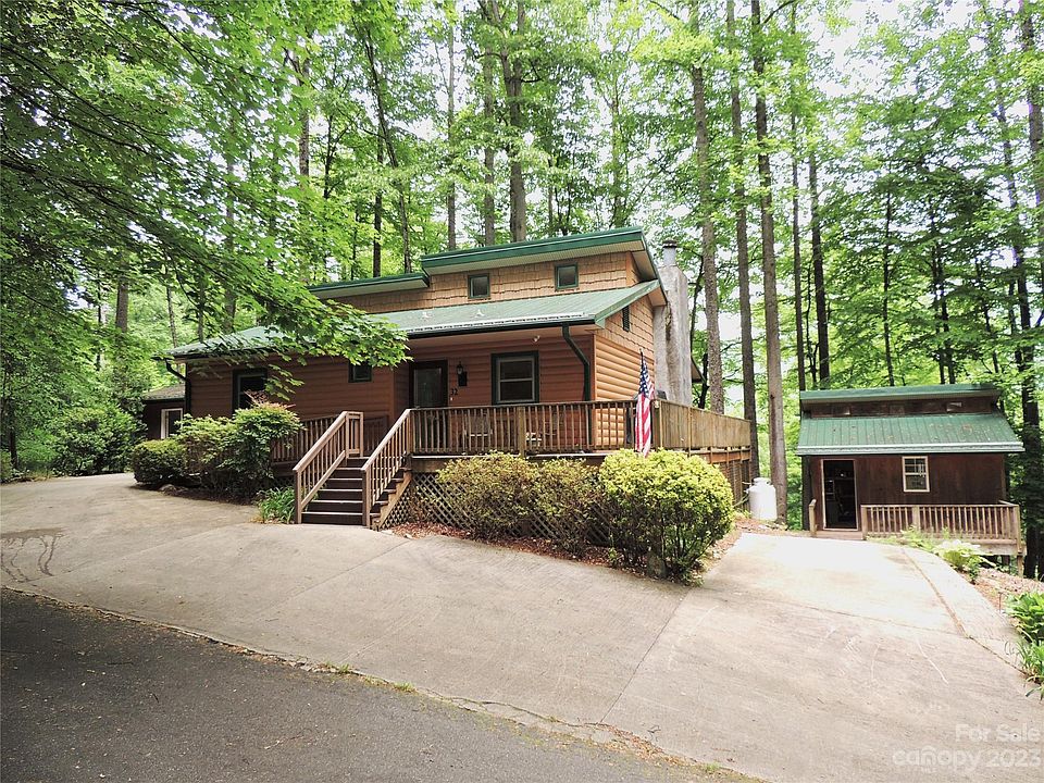 A rare one-level home located in Maggie Valley! The home features an open floor plan with wood floors throughout and laminated wood flooring in kitchen & bathrooms. Gas fireplace (can be wood burning), an open kitchen & an over 100 sq foot sunroom with Pella Sliding doors. Each bedroom has its own in-suite bath with an additional full bath for guests. The primary bd offers a roll-in/walk-in shower. There is a large walk-in closet with additional storage. Enjoy gentle, paved access, plenty of parking for a few cars & an easy access ramp into the home. This low-maintenance home has log siding (vinyl log), a metal roof, new Mitsubishi A/C & heat, cable internet, trash pickup from the town of Maggie Valley. The home sits on a wooded lot & has very nice winter views. The large storage shed would be a great workshop space & a small shed for storage, both complete with electric and lights. Home can be a great STR. Furnishings convey, turn key, move-in ready.