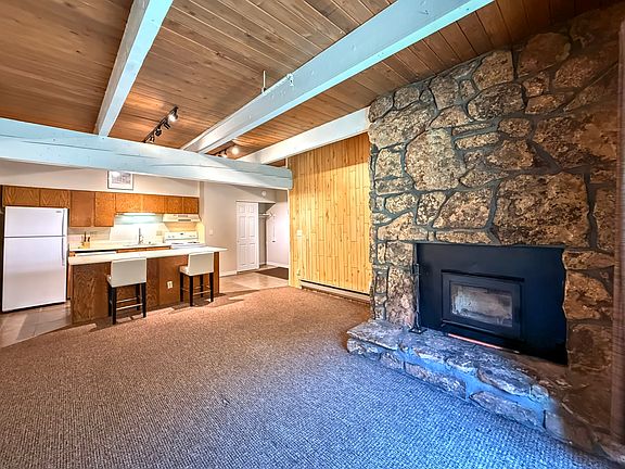 Inside, you'll find an inviting open-concept living and kitchen area featuring a wood-burning fireplace perfect for cozy winter evenings. The condo comes partially furnished with bedroom dressers, kitchen bar stools, side tables, and basic kitchen essentials. The kitchen is equipped with a dishwasher, oven, and refrigerator, plus a brand-new washer and dryer for in-unit laundry.