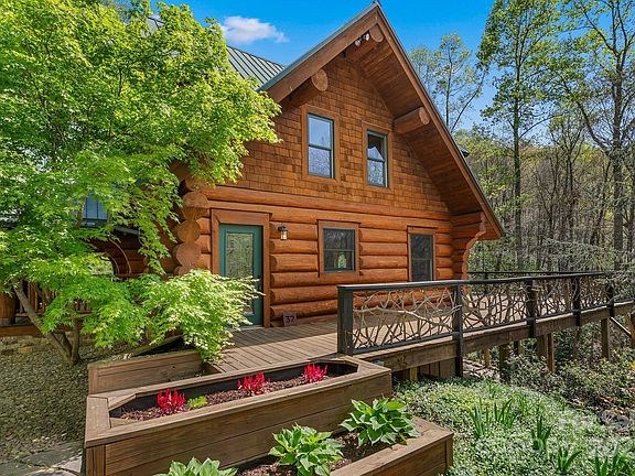 Immerse yourself in the sights and sounds of nature in this private & peaceful setting. Beautiful log home tucked into the woods, yet only 15 minutes to downtown Asheville. As you enter the foyer, you are greeted by a stunning great room that opens to a wrap-around deck. Unique architectural log accents throughout the home. The primary bedroom boasts a spacious bath and it's own access to the deck & loft. Wake up to soothing sounds of the burbling stream. The loft would be a great office or yoga studio. Lots of room for friends & family in this spacious 3+ bedroom, 3.5 bath home, with an updated kitchen, game area, loft room, rec room, & additional bonus bedroom on the lower level. The large recreation room offers a dry-bar & wood-stove. Meander through the garden paths or hike to the nearby waterfall. Plant your flowers & vegetables in the sunlit gardening area. Stone patio and BRAND-NEW cedar shake siding on lower exterior level. Ample parking room & a convenient EV charger. 1.19 acre lot. This home has so much to offer!