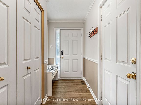 Open House Oct 5th Sunday 2-4pm. Located in the adult lifestyle community of Amberwood Village on a peaceful cul-de-sac, this is beautiful end-unit, semi-bungalow townhome with a single car garage. The home features a spacious foyer with laminate wood flooring and a double closet. The updated kitchen includes classic white cupboards, quartz countertops, stainless steel appliances, a tile backsplash, pot lighting and a breakfast area. The dining room opens to a step-down living room with a wood-burning fireplace and a vaulted ceiling that extends to the second-story loft. French doors lead from the living room to a sunny solarium, which transitions to a private 20 ft. x 16 ft. backyard deck. The main level also includes the primary bedroom with its own private en-suite bathroom. There is also a two-piece powder room, and a separate laundry room. A spiral staircase leads to the second level that features two additional bedrooms, a full bathroom, and a lounge-style loft with an overhead skylight and balcony style railing that overlooks the main living area of the home. The finished basement includes a family room, a large storage area, and a utility room. All-in-all this home has approximately 2,070 sq. ft. of living space plus the basement. The home is within walking distance of Amberwood Golf and Tennis Club, walking paths, and public transit, this home offers a blend of community connection and a peaceful retreat. It is ideal for those looking to downsize or seeking a more relaxed lifestyle. 24 hours irrevocable on all offers.