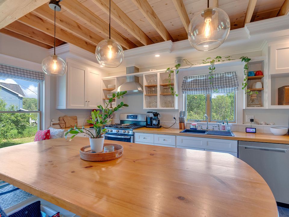 Welcome to your dream home, a charming 3-bedroom, 2-bath haven that combines rustic elegance with modern comfort. Step into the heart of the home: a warm and love-filled kitchen featuring exposed beams, an over-sized island perfect for family gatherings, and a cozy window seat. Bathed in natural light during the afternoons and evenings, this kitchen is an inviting space to create lasting memories. Imagine picking fresh pears from your very own tree and baking delicious pies in this delightful setting.