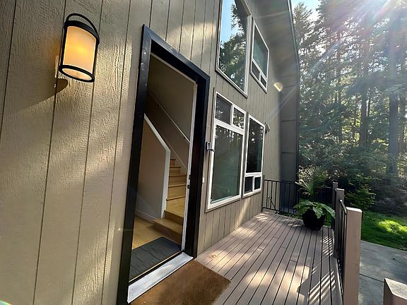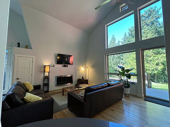 Welcome to the "Mystic Grove". This beautiful home situated in a secluded wooded setting close to downtown Sequim, an ideal location for travelers or those working remotely to explore the Olympic Peninsula. As you approach, you get a sense of privacy inside the surrounding wall of trees. An inviting wrap-around porch, is the perfect place to relax and enjoy the peace of this wooded property that feels like entering a private world yet is located just minutes from downtown Sequim and less than two miles from the John Wayne Marina. Step inside & take in the vaulted ceilings throughout the living space, the beautiful hardwood floors & an open concept living/dining/kitchen space for the whole family to enjoy. The main level offers a spacious formal dining room, clean and modern kitchen with all new stainless appliances & a breakfast bar. The living room features a large flat screen TV & gas fireplace. As you proceed down the hall you will find a wonderful laundry room, full size bathroom with walk in shower, with bench seat, king bedroom with television and another room with a bunk bed (2 full size beds) made specifically to accommodate large adults), plus a pull-out sleeper chair. Venture upstairs and you'll happily discover a loft/game room complete with an assortment of board games & toddler learning toys. Step to your right & enter the spacious king suite featuring a private office, fold down leather sofa, television and a striking master bathroom with double vanity, large tub and walk-in shower with bench seat. Other amenities include Dish TV and fast Starlink Wi-Fi. Parking is on the driveway in front of the garage, or under the 1-car carport. RV space with hookups is also available for an additional fee. Featuring quick access to downtown Sequim, this property lies near the Olympic Discovery Trail, Sequim Bay State Park, John Wayne Marina, & many great trailheads to venture out into the Olympic National Park. After a day of hiking or exploring, enjoy sitting fireside on the lush lawns surrounded by towering trees & foliage, or play a game of badminton (rackets and birdies provided). Subject to availability, as it is available as a vacation rental as well.