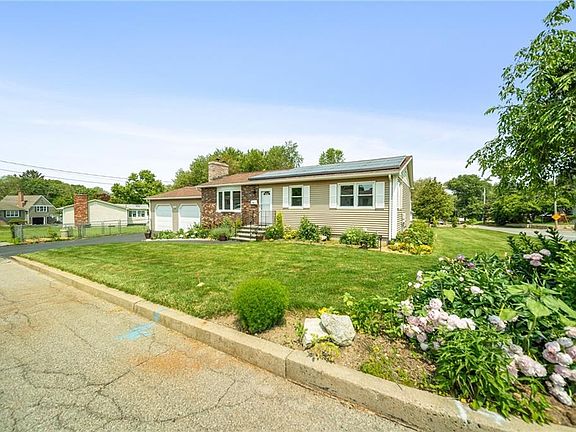 Welcome to this beautifully maintained three bedroom/two bath ranch home, sitting on an impeccably manicured corner lot. This home offers comfortable one level living, with the added bonus of additional living space, guest accommodations, or office space in the lower level. Enjoy year round comfort with central air, and a new pellet stove for warmth and efficiency in the colder months.The spacious two car garage offers great additional storage, and underground irrigation system keeps the property green and lush. With a young roof, replacement windows, energy saving solar panels, and a maintenance free exterior, this home is ready for you to enjoy the summer. Centrally located, and convenient to shopping, highway access, and 15 minutes TF Green International Airport. This home is a must see!