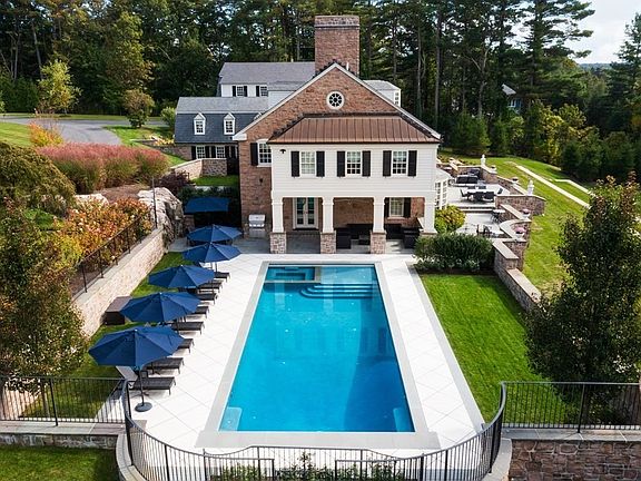 This exceptional private estate is proudly set on 4.8 idyllic acres and is a rare offering in Needham, not to be missed! Just minutes from Needham Ctr and commuter trains, this masterfully crafted home has been fully renovated with the finest materials to meet the needs of today’s most discerning buyer. The dramatic, gated approach is adorned with an apple orchard leading to a sophisticated stone-front entry. The grand, sunbathed foyer has soaring ceilings and is open to the formal living space with breathtaking views of the property. The family room features a cozy stone fireplace and leads to the most exquisite outdoor entertainment area with fenced-in pool. There is an expansive formal dining room, bar area and chef’s kitchen featuring high-end appliances and walk-out patio. The second floor has 7 generous bedrooms, including a luxurious primary suite with spacious dressing room and spa like bath. There is a gym, movie theater and historic wine cellar on the expansive lower level.