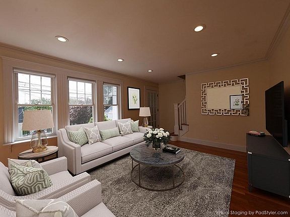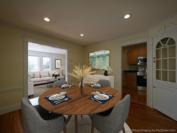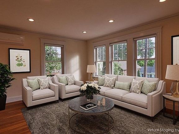 Recently renovated, sunlit 3 level, two+ bedroom townhouse. Move in ready with gleaming hardwood floors and neutral paint colors throughout. Features good size living room and separate formal dining room with classic built in. Modern kitchen with newer stainless steel appliances & granite counter tops. From the kitchen, access to the private stone patio. Two good size bedrooms on second level both with ample closets and each has a recently installed mini-split A/C units. Finished third floor bonus room, perfect for home office, playroom, etc. Private laundry in basement. One car garage parking plus additional off street parking for one car. 9 kilowatts of high efficiency solar panels helps pay electric! New wiring and insulation throughout. Located on quiet street, desirable neighborhood! Short walk to commuter rail, bus lines, Centre St. shops, YMCA. Sorry, no pets. Easy to show. (photos are digitally staged)