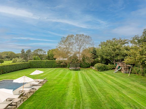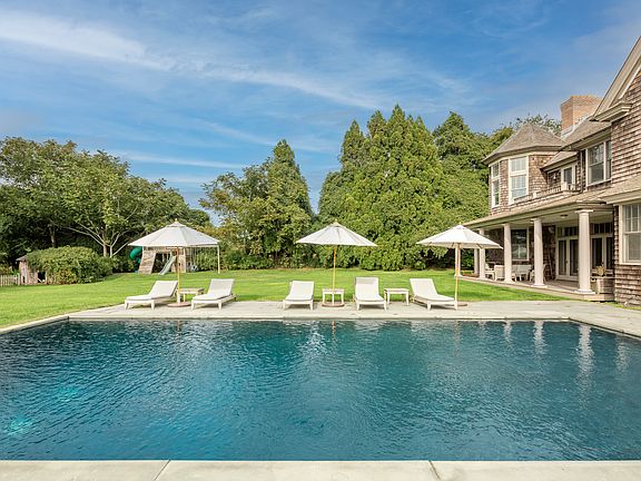 Rental Registration #: Owner updating 9/29 Crafted and tailored by interior designer Gideon Mendelson and published in Hamptons Cottages & Gardens, this impeccably fashioned 4,800+ square foot home is located at the end of a white pebble driveway amid nearly 1.4 pastoral acres. A quintessential covered porch welcomes you into the ample entry foyer, with highlights of the first floor including a large sunken living room with three sets of French doors, a woodburning fireplace, a grand piano, and a stylish turreted library; an eat-in chef's kitchen with high-end appliances, a butler's pantry, a generous center island, and a windowed seating area; and a bright family room with French doors and a built-in TV. A junior primary suite/personal gym, a separate mudroom, a laundry room, and a half bath complete the amenities of this level. A traditional staircase with a fun pop of color leads to the second floor, which plays host to the substantial primary bedroom with high ceilings, a woodburning fireplace, a walk-in closet, an ensuite bath with double sinks, a stall shower, and jetted tub, a private deck overlooking the grounds, and a second turreted space - this one used as an office and highlighted by a spectacular Sputnik chandelier. A second ensuite guest room is located at the end of the hall, with two additional bedrooms, a guest bathroom, and landing area finishing this space. The basketball hoop and spacious front lawn - large enough for a game of football, soccer, or other summer lawn sports - are only slightly outpaced by the beauty and sheer size of the expansive backyard. The heated gunite pool is buttressed by a bluestone patio and barbecue area, while a covered wraparound porch plays host to multiple seating areas that are ideal for entertaining, and a shaded hammock to temporarily escape the summer sun. A colorful playground provides a playful distraction for the kids, while the vast lawn and secret vegetable garden inspire the adults. This secluded locale is only a few doors down from Wolffer Vineyard and just down the road from Loaves and Fishes, the newly renovated Sagaponack General Store, and our beautiful ocean beaches.