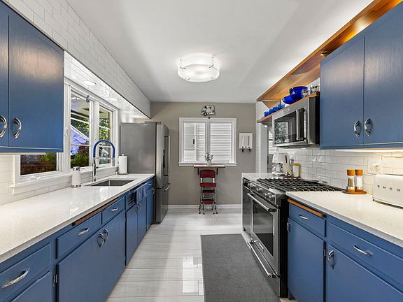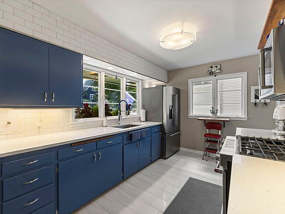 Mid Century Modern Bryn Mawr home that lives larger than its square footage. Thoughtfully updated while maintaining mid-century character, this property offers flexible living spaces with great flow for entertaining. The light-filled living room features wood beams, paneled walls, and cantilevered picture window overlooking the private, park-like backyard with mature trees and a fountain. A step-up dining room and stylish kitchen showcase blue cabinetry, stainless appliances, subway tile backsplash, and quartz countertops with a waterfall design that add modern flair. Enjoy the inviting three-season porch and spacious deck, perfect for hosting gatherings or relaxing outdoors. Two comfortable bedrooms and an updated full bath with gorgeous tile floors & subway tile shower surround complete the main level. Updates include new roof 2023, central air 2020, gorgeous exterior improvements and modern interior finishes -the big stuff has been done! This small home lives large, and there’s opportunity for the next owner to expand with additional square footage and a second bath in the lower level if they desire. The ceiling height is grandfathered in due to age of the home. Set on a quiet dead-end street yet close to walking and biking trails, Theodore Wirth Park, local shops, restaurants and easy access to city amenities. This is a rare chance to own a move-in ready home with character and room to grow.