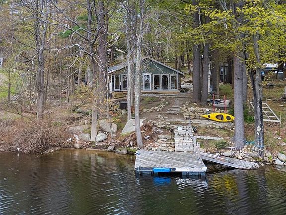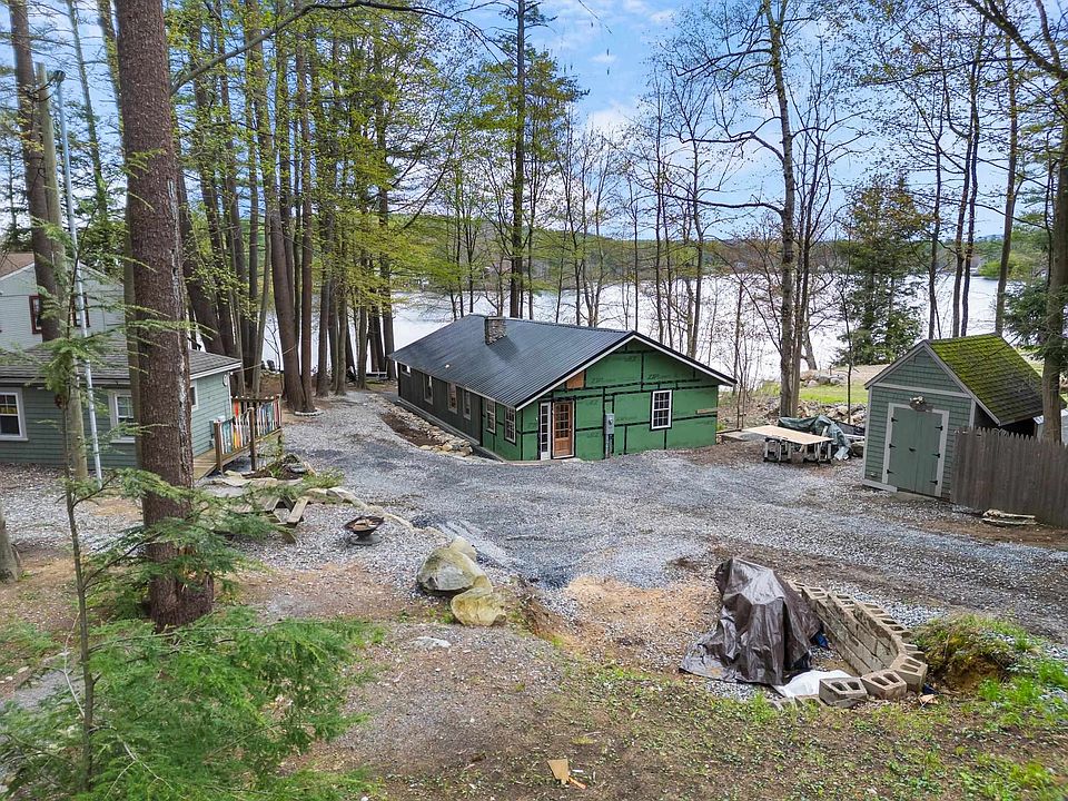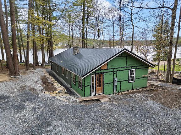 32 Shore Drive, Merrimack, NH Direct lakefront home with dock on 222 acre Baboosic Lake which has no boat restrictions. Home is nearing completion of a complete renovation which included; 90% brand new framing, new 200 amp underground electrical service, new plumbing, brand new 75 year metal roof, new windows and doors, new kitchen and baths. Most rooms have lake views including the open kitchen to the cathedral ceiling living room with new granite floor to ceiling chimney and wood burning fireplace, primary bedroom with full bathroom with walk--in shower and 3 shower heads, water-proof crawlspace with spray foam insulated walls. Detached studio guest house with deck and all new electrical, windows, insulation, finishes and new roof with a 35 year architectural shingles. Large shed, fire-pit, floating dock, and additional upper street parking. Lot is at the end of a cul-de-sac and offers both privacy and great lake views. Owner/Builder is willing to contract to complete the renovation for $50,000 which will include new sheetrock walls, interior trim and doors, flooring, guest bathroom completion, kitchen stove, exterior siding.