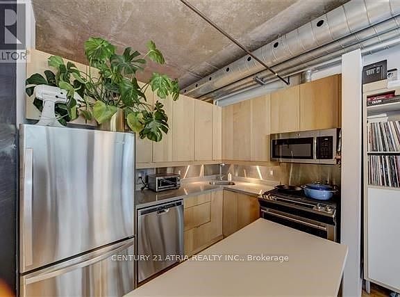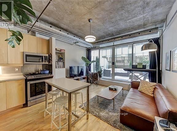 Welcome to The Stewart Lofts, a mature boutique King West building known for its rare soft-loft character and unbeatable location. This eight-storey, 46-unit low-rise is one of the most desirable loft residences in downtown Toronto, offering a quiet, design-forward living experience steps from King St West's best restaurants, cafes, nightlife, fitness studios, and the Financial District. Unit 202 delivers true loft living with 10 ft exposed concrete ceilings, floor-to-ceiling windows, hardwood floors, and a functional open layout flooded with natural light. The updated kitchen features new stainless steel appliances, a gas range, quartz countertop, and ample storage. A standout highlight is the massive 225 sq ft private terrace, perfect for entertaining, relaxing, and outdoor dining-complete with a rare gas BBQ line and additional storage space. This suite also includes in-suite laundry, efficient climate control, and a clean, move-in-ready interior ideal for urban professionals. Enjoy unmatched walkability with access to streetcars, shopping, parks, the Waterfront, entertainment venues, and major business hubs. The boutique nature of the building ensures privacy, exclusivity, and a unique lifestyle not found in larger condo towers. A must-see opportunity for those seeking style, character, convenience, and premium downtown living.