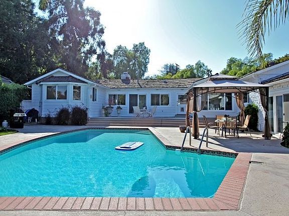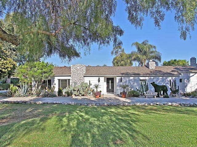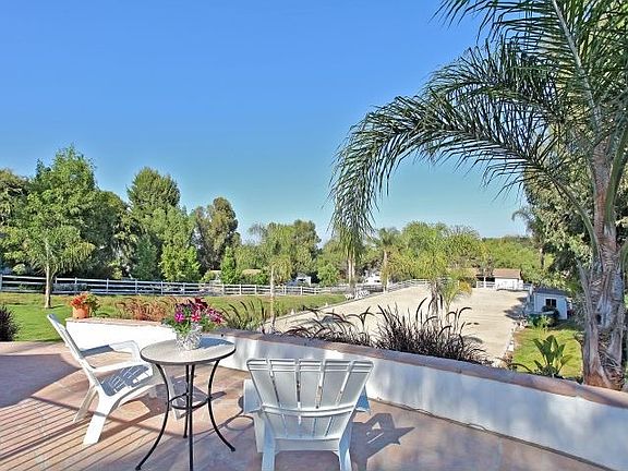 Located on a "quiet country lane" is this equestrian estate. This is a level 50,000 sq. ft. lot (approx.) with a 20 X 50 meter dressage riding arena with a ring of steel barn. There are 3 stalls, a tack and hay room, and corrals adjacent to RHE riding trails. Up next to the house is a solar heated pool, cabana, and grass lawn. The single story remodeled ranch home has a lovely open beam trestle ceiling in the living/dining room with fireplace.The master suite has his and her walk-in closets, fireplace, and spa bath plus shower. Off the kitchen is the step down family room with a view of the riding arena and pool.