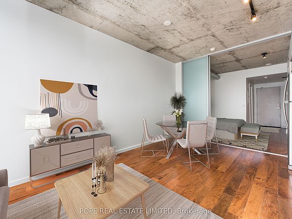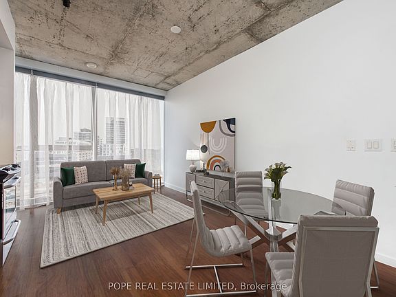Completed in 2015, 32 Trolley is an architectural triumph by acclaimed Saucier + Perotte Architectes, Urban Capital & Waterfront Toronto. River City Phase 2 is situated on the lower eastern edge of downtown in the desirable Corktown & The West Donlands neighborhoods. Very well connected to Riverside, Leslieville, Distillery District, St. Lawrence Market, Corktown Commons Park, Don River Valley Park & Toronto's Waterfront Trail System & TTC 504A/504B/501. A modern jr 1 bedroom loft style apartment showcasing approximately 452 sf of very usable interior space, sleeping area, 1 bath, 9 ft exposed concrete ceilings, galvanized spiral duct, walnut hardwood floor throughout, modern kitchen featuring glossy grey flat slab doors, s/s appliances, quartz countertop, a fully tiled spa inspired bath featuring soaker tub, shower, large vanity & vanity mirror, and overlooking grassy greenbelt flanking the Don River. 1 bicycle rack included. The building features 24hr security, a well equipped gym, large party room featuring lounge, bar, kitchen, dining area, shuffle board & billiards table, comfortable guest suite, outdoor pool, sun deck & outdoor grilling area.