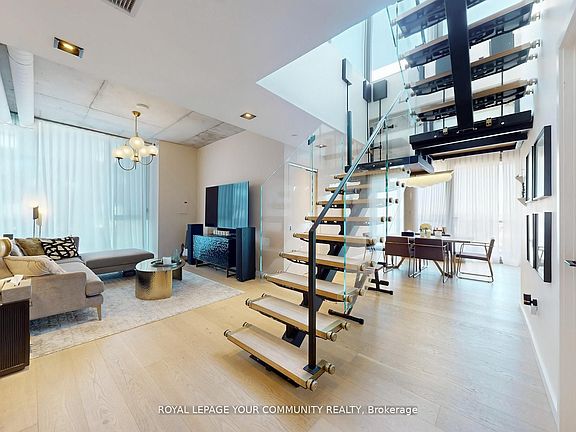 Experience elevated living in this rare 2-storey penthouse, meticulously redesigned to blend modern sophistication with everyday comfort. Offering 1,545 sq. ft. of open-concept living space, this fully furnished, move-in ready residence is crafted for those who appreciate fine details and effortless entertaining. Upon entering, you're greeted by an architectural statement piece the floating wood and metal staircase with glass railings setting the tone for the homes contemporary elegance. The main level flows seamlessly, with expansive living and dining areas opening to an uninterrupted 55-foot balcony spanning 197 square feet, complete with three separate walk-outs. Natural light floods the space, enhancing the bright, airy atmosphere. The gourmet kitchen overlooks the living space, perfect for gatherings both large and intimate. Two bedrooms and two full bathrooms are thoughtfully situated on the main floor and separated by the kitchen and dining rooms to offer privacy. The principal bedroom is a retreat with a spa-inspired ensuite and a generous walk-in closet. Every detail has been professionally redesigned and renovated to enhance both style and comfort, ensuring a turnkey living experience. Upstairs, a sunny den opens onto your private 1,174 sq. ft. terrace professionally landscaped and thoughtfully furnished for effortless living. With a built-in BBQ, multiple lounging areas, and a setting designed for gatherings or quiet evenings, it is truly an entertainers dream. This residence is more than a home its a lifestyle. With its rare blend of interior luxury and unmatched outdoor living, this penthouse offers a turnkey opportunity to step into urban sophistication at its finest.