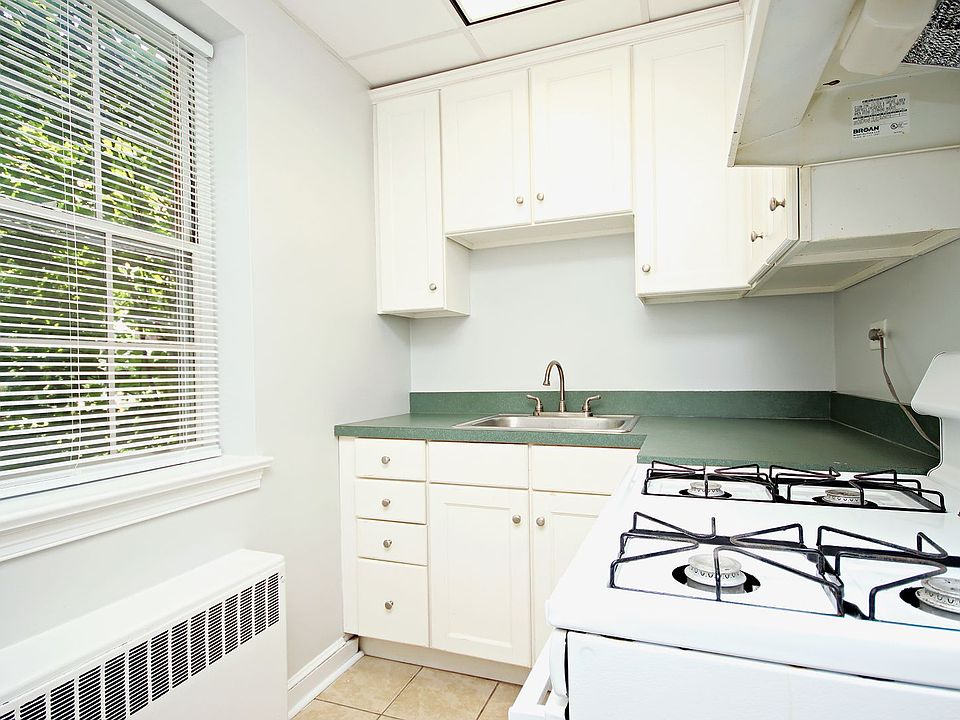 This 663 sqft, third-floor apartment offers parquet flooring, a living room with a cozy dining nook, a kitchen with a full-size refrigerator and gas range, two bedrooms with ceiling fans and closet space, and a full hall bath. The apartment includes window AC units.
