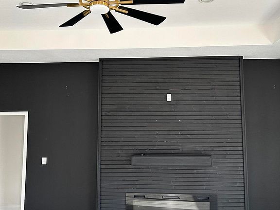 Attached carportElectric fireplaceAmple outdoor spaceMaster suiteTray ceilingStylish black accent wallSleek black cabinets