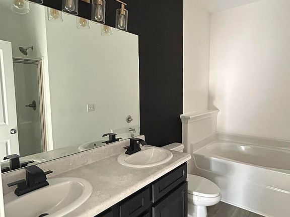 The kitchen and bathrooms are equipped with sleek black cabinets, offering a contemporary touch. The master suite is a true retreat, complete with a huge bathtub and a luxurious walk-in shower, perfect for unwinding after a long day.