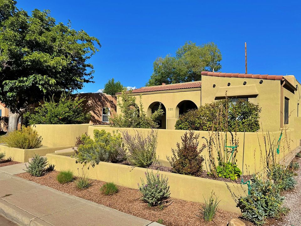 Stunning Mediterranean home in historic Monte Vista, the neighborhood in the literal heart of Nob Hill. The front porch features a distinctive covered triple-arch with twin alcoves for fabulous alfresco meals. Come on in...Notice the smooth figure 8 floorplan that brings the large skylighted living room, the private dining room, & the spacious kitchen all together. See the 3D Tour! Leopard's Mane granite counters, glass mini-subway tile backsplash, slate flooring, stainless, & long b'fast bar make the kitchen a favorite room. The primary bedroom comes in close 2nd, w/ its strategic privacy, vaulted pine plank ceiling, spacious bathroom & envy-inducing walk-in closet. Backyard is lush & private. 2-car garage, solar panels + huge basement. Wow--this is the best of Nob Hill.
