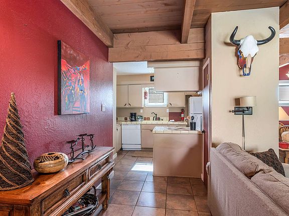 Lovely single level 2BD, 2BA in a very desirable location within the Fort Marcy development. Easy access and close to parking. En-suite master with jetted tub. Beamed ceilings and tile flooring throughout - NO carpeting. Extra windows added for cross breeze. Forced air heating and refrigerated AC. Complete furniture package conveys at no added cost! 100% turn-key. On-site management for HOA and short-term rental program. Strong potential for income. Walking distance to plaza. New indoor hot tub and swimming pool, open year 'round. Great for skiers! Here's the perfect, income-producing, downtown vacation home in Santa Fe at an affordable cost!