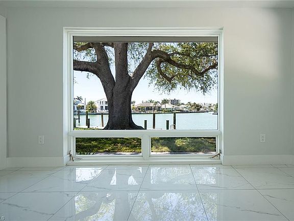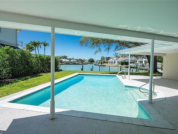 This is the optimum waterfront site for a sailor or power-boater who wants a sheltered mooring site with almost immediate access to the gulf. Doctor's Pass is five minutes from the dock. There are no bridges and adequate depth! The southwest exposure from the rear yard and dock provides stunning sunsets over the wide lagoon, and the soft prevailing sea-breezes keep the pool area comfortable year-round. The residence has been completely re-constructed over the last two years with a new roof, new partition walls, baseboards, cabinetry baths, appliances and HV/AC equipment, and is ready for owner decorating and occupancy or rental. The floor plan has split primary suites, a third guest bedroom and a large den or office. Surrounded by mature live oaks in one of Naples loveliest neighborhoods, it is offered at lot value and awaits your pleasure.