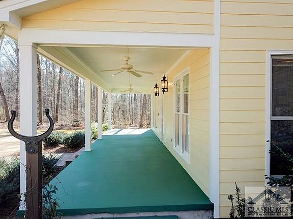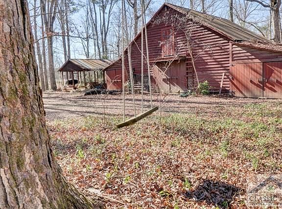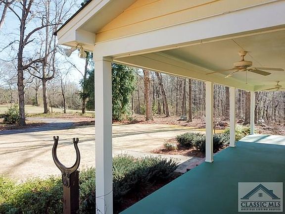 Enjoy nature at this quiet mini-farm on 10 acres of beautiful conservation designated land with a two story farm-style home that sits in the heart of Winterville. Turn in the gated entrance with brick pillars and iron fencing and drive under the old growth pecan trees which line the paved and lighted driveway. The 2009 renovated home sits in a professional landscaped yard with multi-zoned irrigation amongst mature hardwoods. An added BONUS is the RV pad complete with a 240V outlet, water and septic hook-up. A huge rocking chair front porch overlooks the front pasture for many stunning views. The front field could be used as a horse pasture or just to enjoy the setting. Step in the front door to LOTS of natural light with large windows which brings the outside into the home. There is true hardwood red oak flooring on the main level along with two fireplaces and ceiling fans throughout the home. The kitchen boasts custom cabinets, gas range, solid surface counter tops, pantry and a butcher block island. Look out the kitchen window to many GREAT VIEWS! The large great room with a fire place, master bedroom, utility room and half bath are on the main level. Upstairs there are two spacious bedrooms with large closets that share a full bathroom. Above the over sized two car garage is a HUGE bonus room. There is a full bathroom in the garage that can be used with the bonus room or to clean up before entering the home. There is also a back covered patio and open deck to provide for your grilling and meals out doors. The barn is approximately 100 years old. It too was recently restored using traditional building techniques and materials including white cypress siding and reclaimed oak. The barn maintains its original appearance while storage for equipment such as mowers, tractors and trailers has more than doubled. The original mule stalls and feed room are still intact as is the hayloft upstairs. A separate covered BBQ pit with gas and water available. T