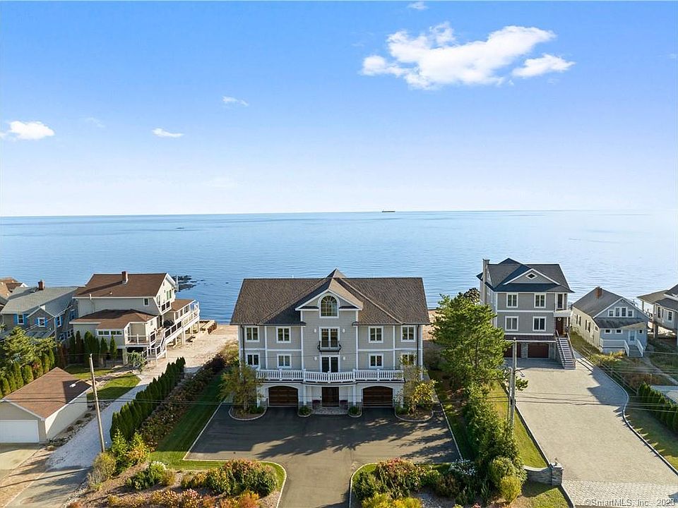 Nestled along the picturesque shores of Long Island Sound in Connecticut, this luxurious beachfront home sits on .53 acres, offering a private sandy beach and commanding views of the glistening Sound. The main level reveals a spacious open floor plan with a generous 58-foot-wide combined living & dining area. Sliders beckon you to step out onto a sprawling 1,700-square-foot deck, creating a seamless indoor-outdoor flow. The interior exudes an air of elegance with 9-foot ceilings, 8-inch-wide oak floors, thick crown moldings, and a gas fireplace that invites cozy gatherings. A standout feature is the chef's kitchen, which is sure to delight culinary enthusiasts. It offers a breakfast bar, granite countertops and a central island that's perfect for meal preparation & casual dining. The kitchen is equipped with top-of-the-line appliances, including a 8-burner WOLF cook-top and custom cabinetry. Convenience and sophistication converge with the inclusion of a temperature controlled walk-in wine room, making it easy to indulge in your favorite vintages. A home office offers a dedicated space for work or study. Three en-suite bedrooms are on the second level, including a master suite with a gas fireplace, a private deck, a sumptuous full bath with a soaking tub and steam shower, and a generously sized walk-in closet w/built-in storage. The upper level provides generous spaces and a half bath offering the possibility of a recreation room, home theater, game room or a 4th bedroom. This coastal masterpiece was thoughtfully constructed in 2016 and offers an expansive 6,389 square feet of living and entertaining space with captivating water views creating a sense of serenity and connection to the surrounding natural beauty. Enjoy direct access to your own private sandy beach that stretches along Long Island Sound; swim, kayak, paddle-board board from your own backyard. This hard to find feature is a beach lover's dream, offering unparalleled opportunities for relaxation, recreation, and enjoyment of the coastal lifestyle. Additional features include central A/C, elevator, heated garage accommodating up to 6 vehicles, whole-house generator, irrigation system, whole house Lutron Lighting System, Security Camera System w/10 cameras, natural gas, city water & city sewer. This home was built to FEMA reqs. and sits above flood hazard. Convenient to an array of shops and restaurants, Yale, major highways and commuter rail, and only 90 minutes to New York City. An absolute stunner!