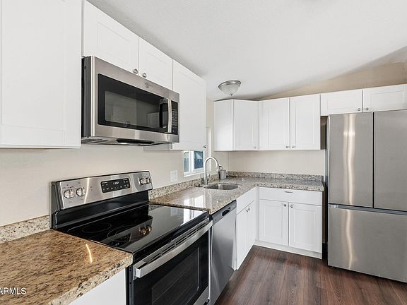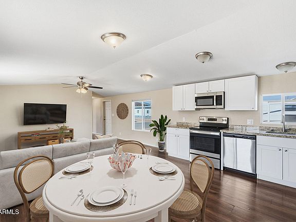 You wont find a more updated home in all of Mesa for under 100k. Completely renovated and move in ready. Light and bright, open concept floorplan. Kitchen boasts granite counters, new crisp cabinets and stainless steel appliances. Luxury vinyl plank throughout. New water heater, waterlines and fixtures, new dual pane vinyl windows. Enjoy the cool new energy efficient AC system! Carport and extended covered patio lead out to updated desert landscaping. Lot lease is $795/mo plus tax and includes water/sewer.